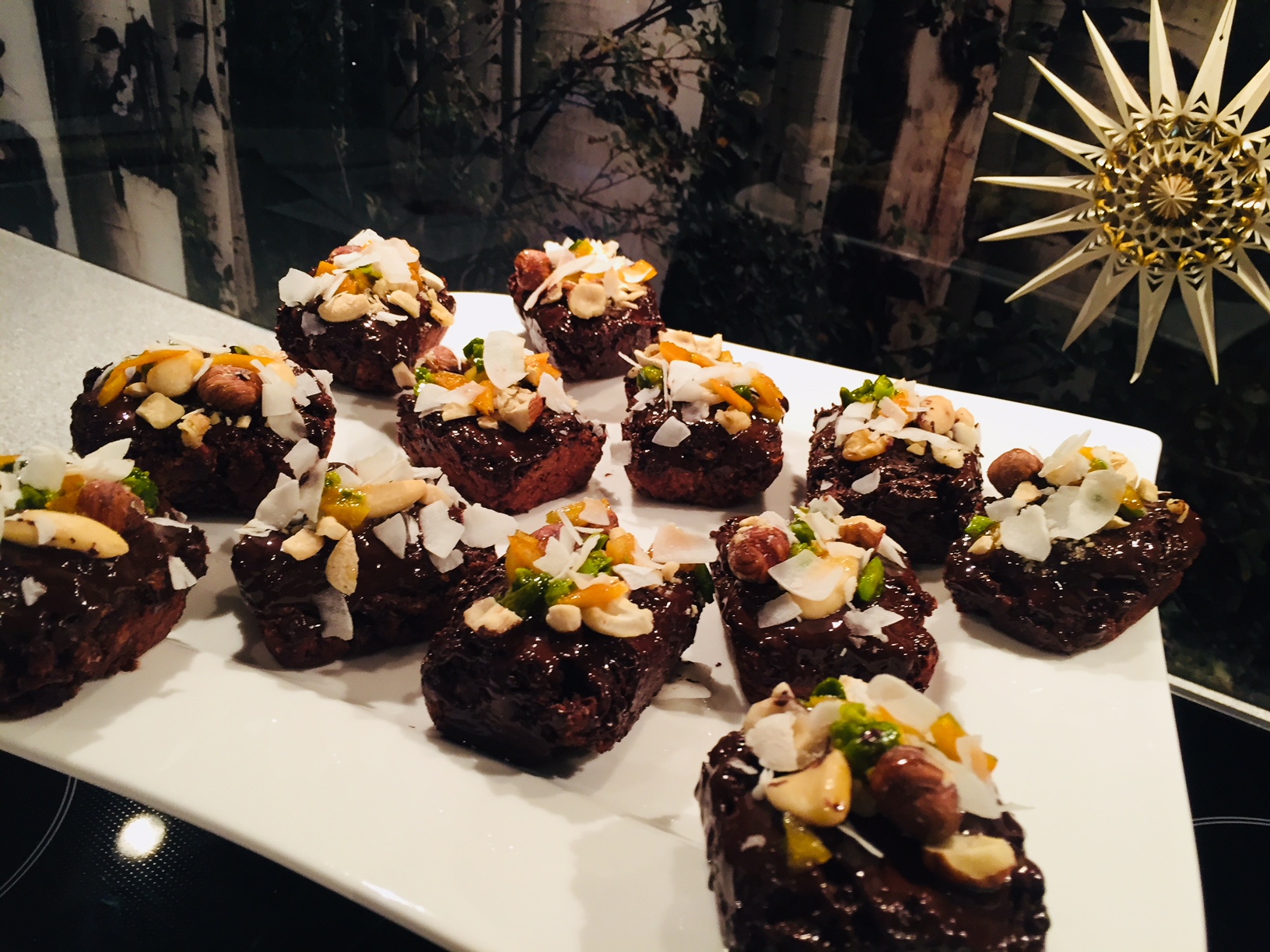 - Kuchen aus dem Ofen nehmen, in 12 Brownies schneiden. Brownies aus dem Maker oder dem Ofen rund rum mit Kuvertüre bestreichen und sofort mit Nüssen und Kokosspalten bestreuen und darauf die Orangen-Pistazien-Honigmasse geben. Die Brownies schmecken warm und kalt.