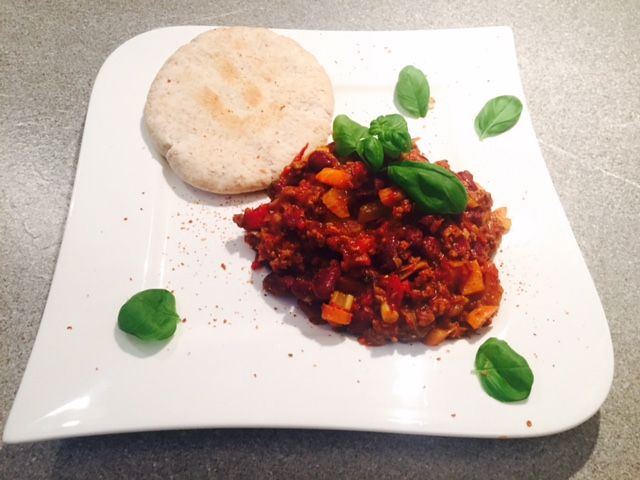 - Das Gemüse zum fermentierten Tofu bzw. Hackfleisch geben, Chili, Tomatenmark und Thymian dazugeben und ebenfalls anbraten.