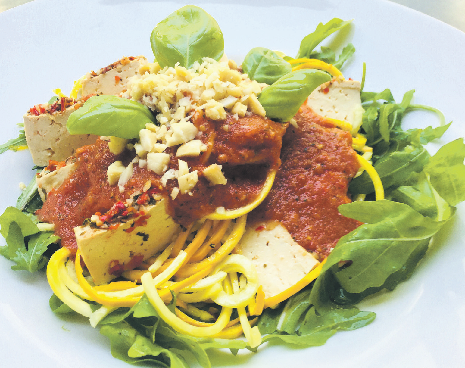 2 Zucchini oder Gurken (600 g),200g Feto (Fermentiertes Tofuprodukt mit Paprika von Taifun) oder 100 g Mozzarella, 50 g Rucola, 50 gehackte Mandeln, 1 Handvoll Basilikum.